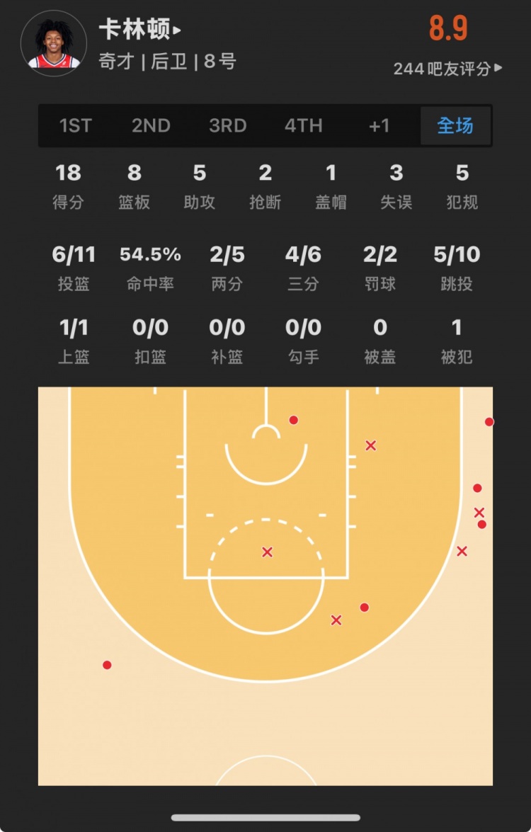 奇才14号秀 卡尔顿-卡林顿 登场44.6分钟