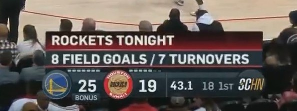 19-28落后勇士!火箭首节投进8个球 出现7次失误