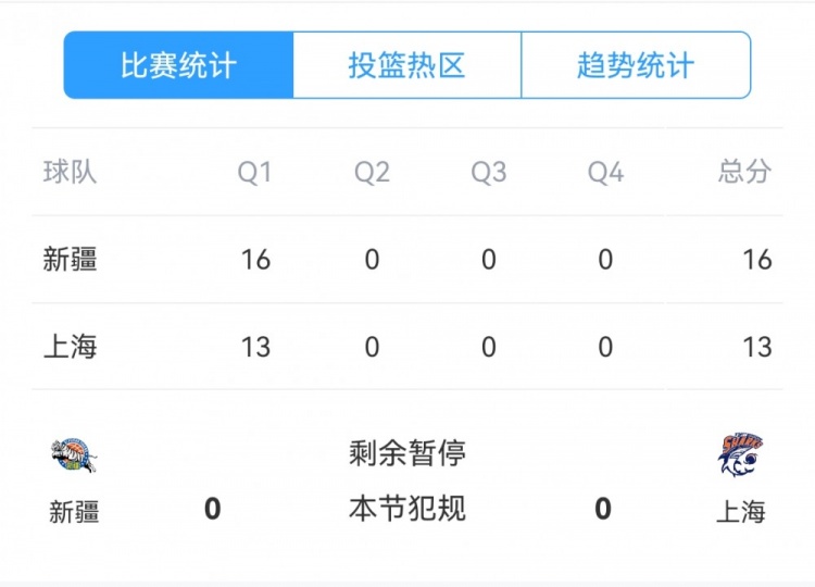 第一节,双方力拼防守,得分都很困难,新疆全队23投6中,三分11中2,罚球2中2单节拿到16分;
