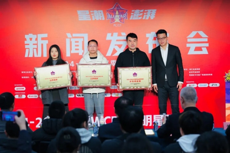 发布会最后,深篮体育(北京)有限公司WCBA项目负责人杨润章和浙江蕞红体育文化策划有限公司董事长杨笑一起,为全明星周末赞助商代表举行了授牌仪式。