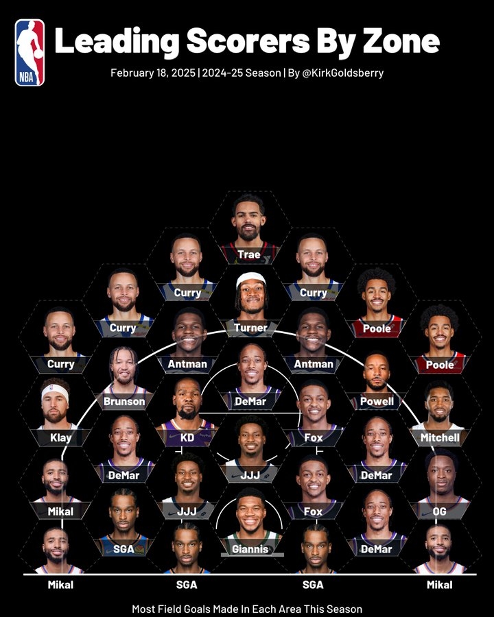 各区域得分王:库里右侧45度最多 大桥底角之王 字母SGA制霸篮下