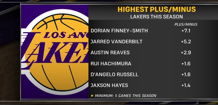 本赛季湖人队内正负值排行:芬尼-史密斯+7.1第一 詹姆斯无缘前六