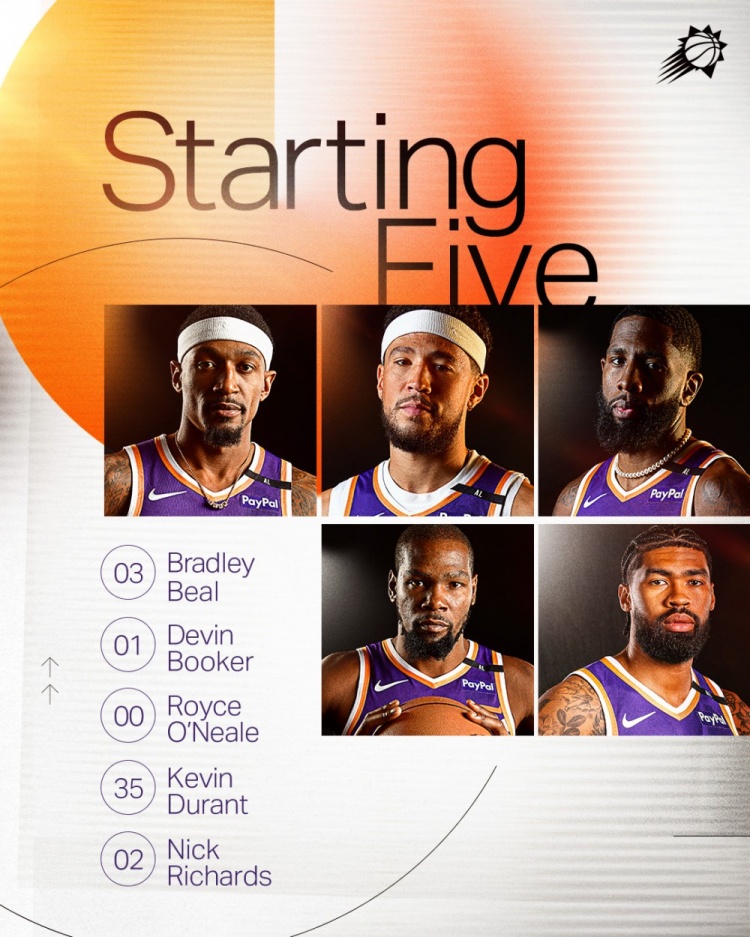 今日对阵猛龙!太阳首发:比尔、KD、布克、R-奥尼尔、理查兹