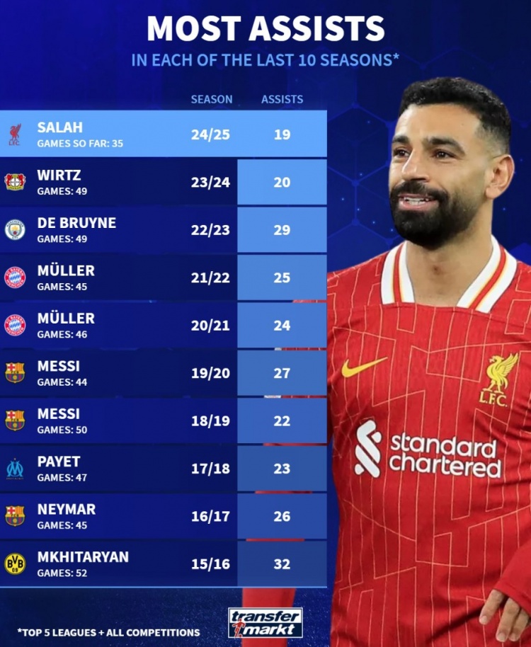近10赛季各项赛事助攻王:姆希塔良32次最高,梅西穆勒两度上榜