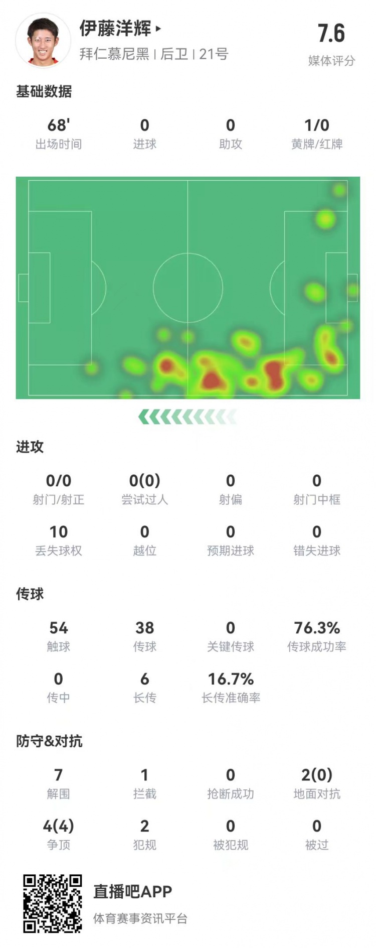 伊藤洋辉拜仁德甲首秀:7解围+1门线解围,6长传1成功 获评7.6分