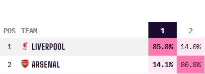 最新演算结果显示,利物浦的夺冠概率为85.8%,大幅领先于阿森纳的14.1%。