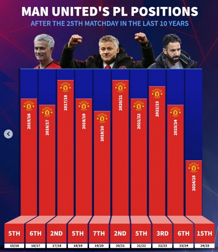 近10年曼联英超25轮后排名:此前九年最差第7,本赛季第15