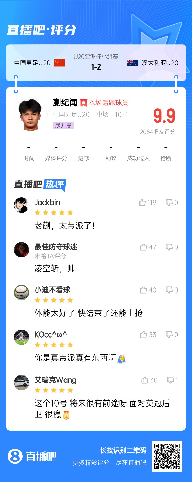 U20亚洲杯小组赛A组第三轮,中国队1比2负于澳大利亚队