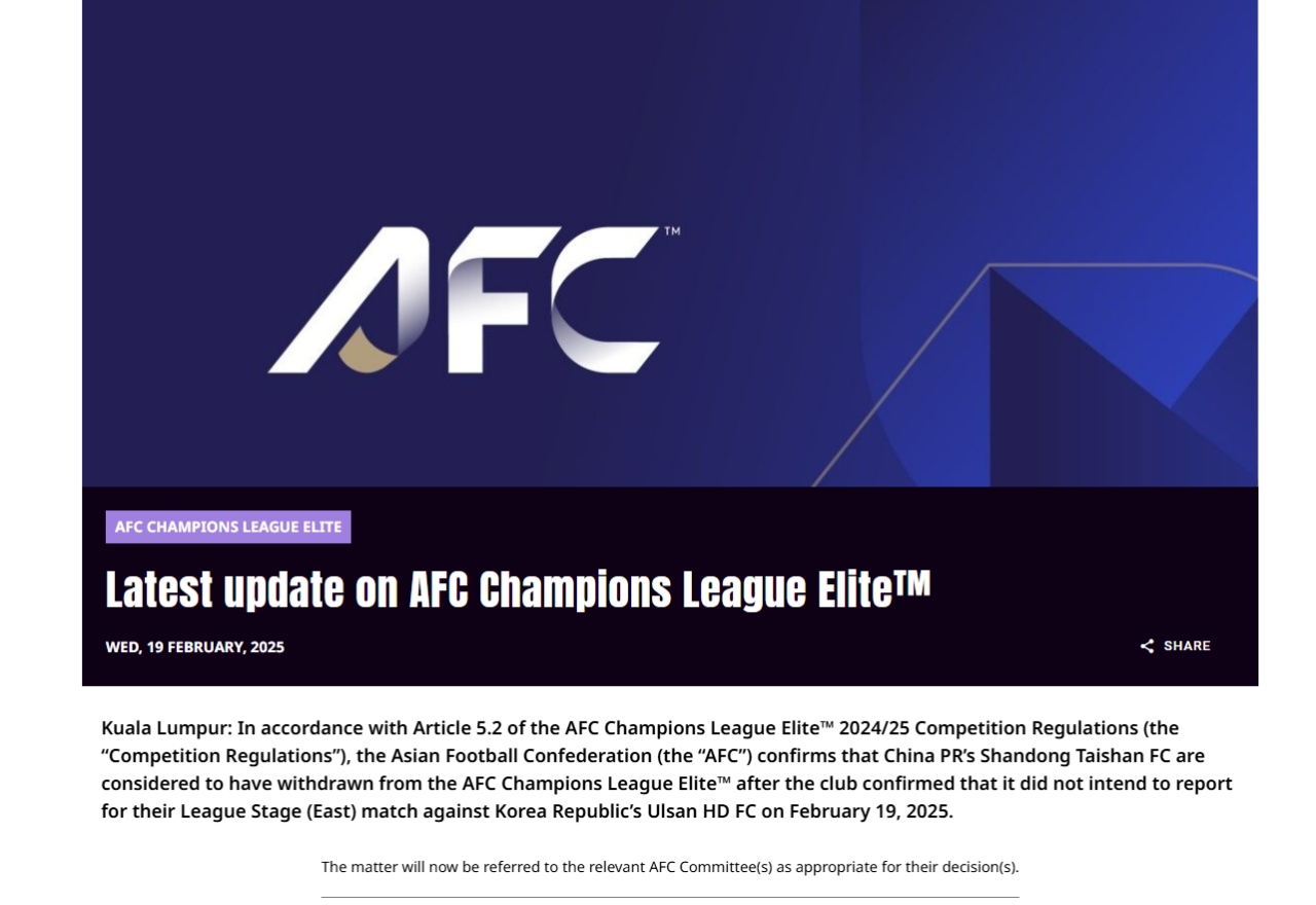 韩媒:泰山请求亚足联取消本场比赛,亚足联最终判定泰山亚冠退赛