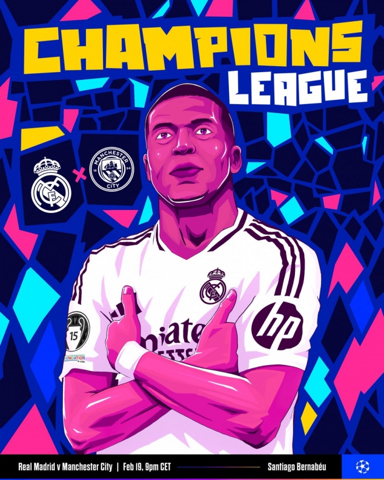 皇马社媒发布欧冠对阵曼城海报:姆巴佩做出标志性庆祝动作