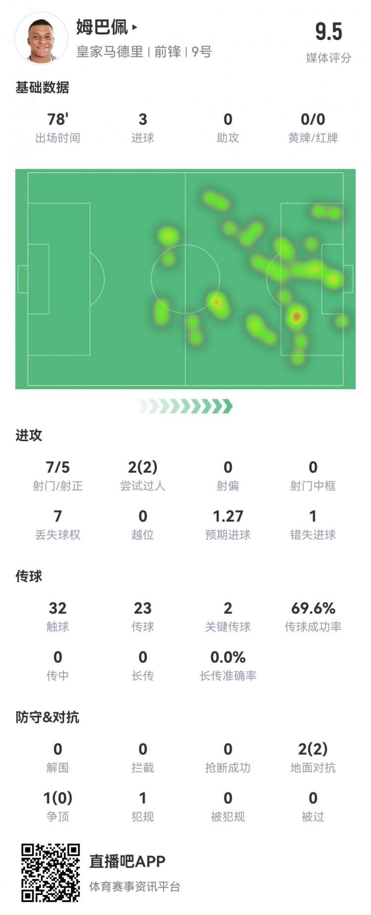 完美发挥!姆巴佩本场数据:7射5正戴帽!2次关键传球,评分9.5