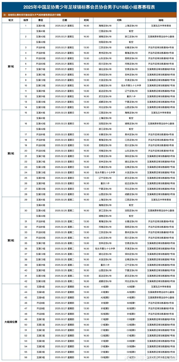 2025年中国足协青少年足球锦标赛会员协会男子U18组小组赛赛程表 ????️