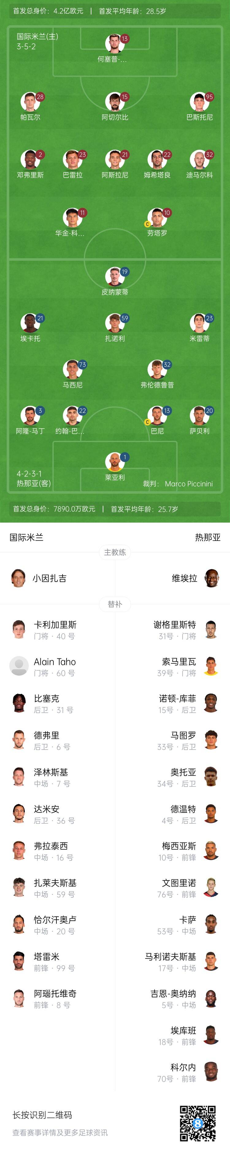 热那亚首发:1-尼科拉-莱亚利、20-萨贝利、13-巴尼、22-J-巴斯克斯、3-阿隆-马丁、32-弗伦德卢普、73-马斯尼、23-米雷蒂、59-萨诺里、21-埃卡托、19-皮纳蒙蒂