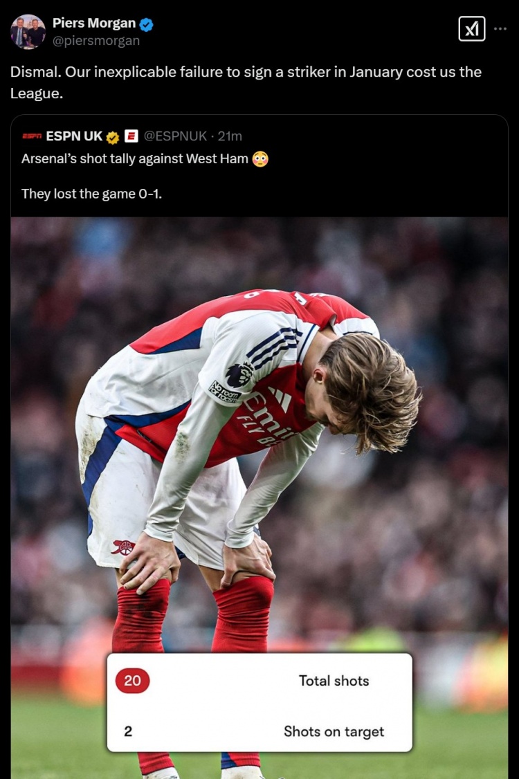 20脚射门仅2射正!摩根吐槽:冬窗不买前锋葬送了阿森纳的冠军