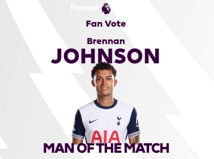 梅开二度!官方:布伦南-约翰逊当选热刺4-1伊普斯维奇全场最佳