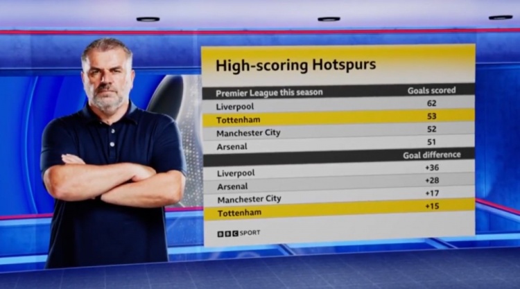 热刺本赛季英超打进53球仅次利物浦,净胜球+15排名英超第四