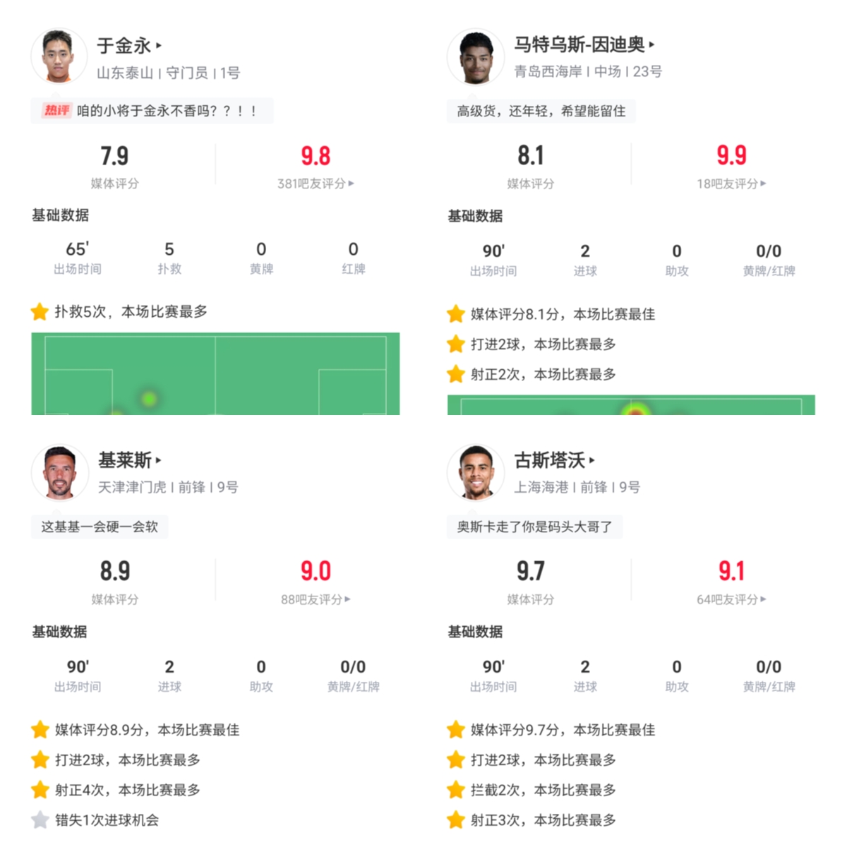 中超首轮最佳球员得票率前三: