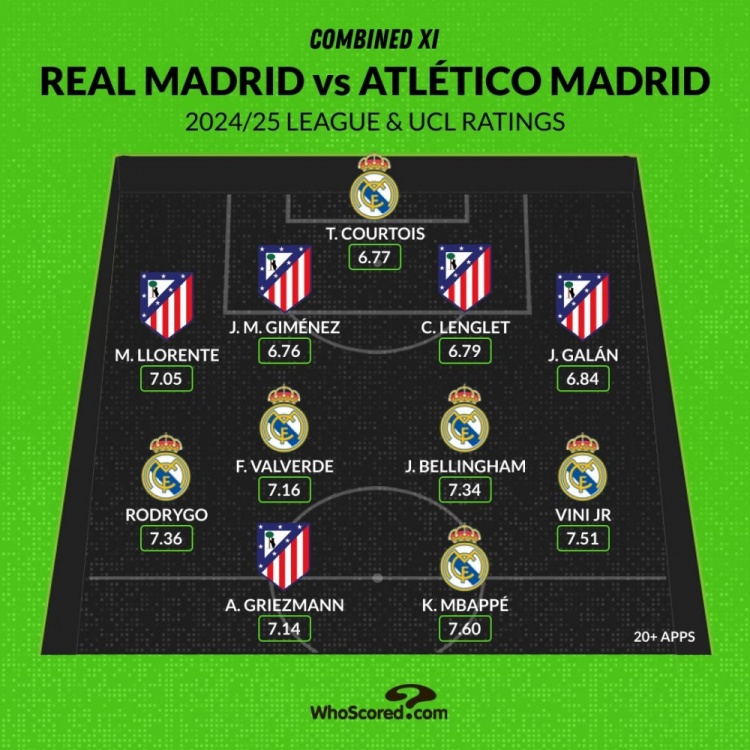 马德里德比评分最佳阵:姆巴佩、维尼修斯领衔,贝林、格子在列