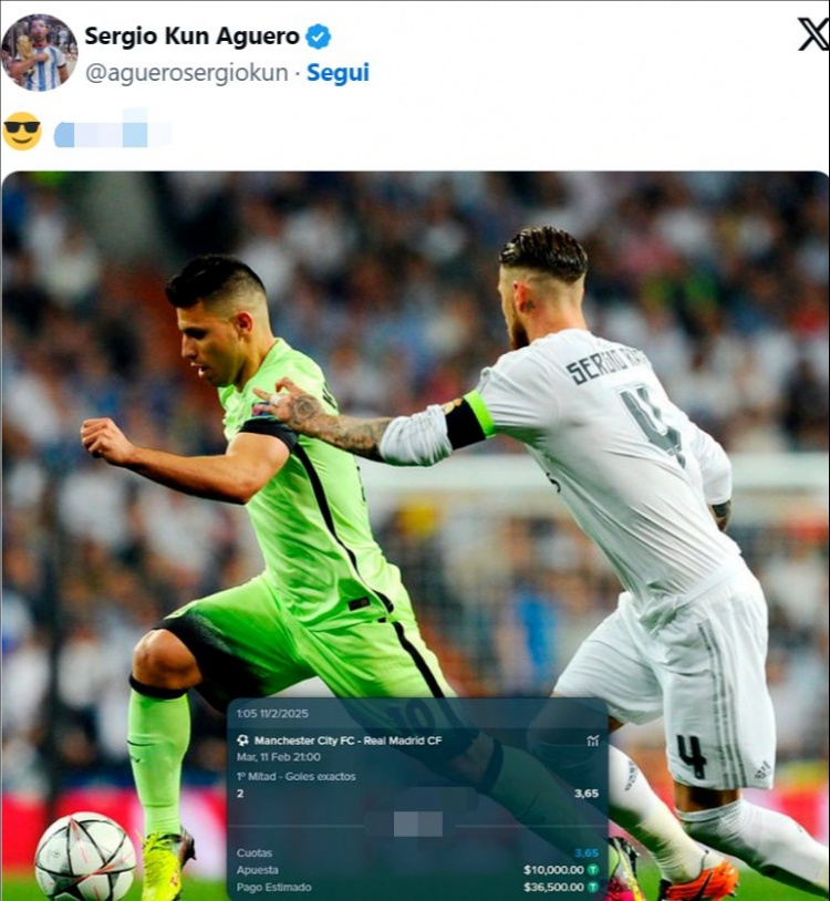 助兴!阿圭罗下注曼城vs皇马上半场2球,最终1-0结束输掉1万美金